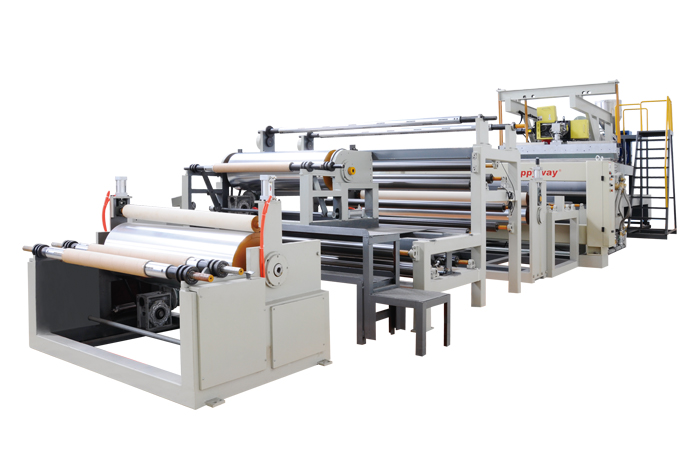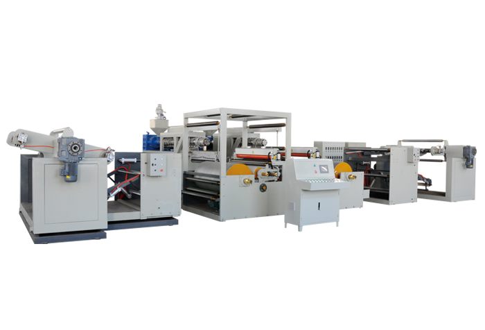 本机组用聚乙烯(PE)或聚丙烯(PP)为原料与塑料编织布进行复合,广泛应用于宽幅篷布、土工布、纸、编织布等制品。该机组采用悬挂式挤出机,行走稳结构合理,配套有高精确度双向调节平膜模具。复合系统采用油压装置,压力大,稳定可靠。放卷系统采用无轴放卷,气压锁紧,适合小口径纸管;收卷采用摩擦式,带气动横切刀,卷取平整。操作控制系统采用进口元器件,PLC控制,人机界面触摸屏显示、联动控制,质量可靠,运行稳定。各种数据一目了然,操作直观简单。